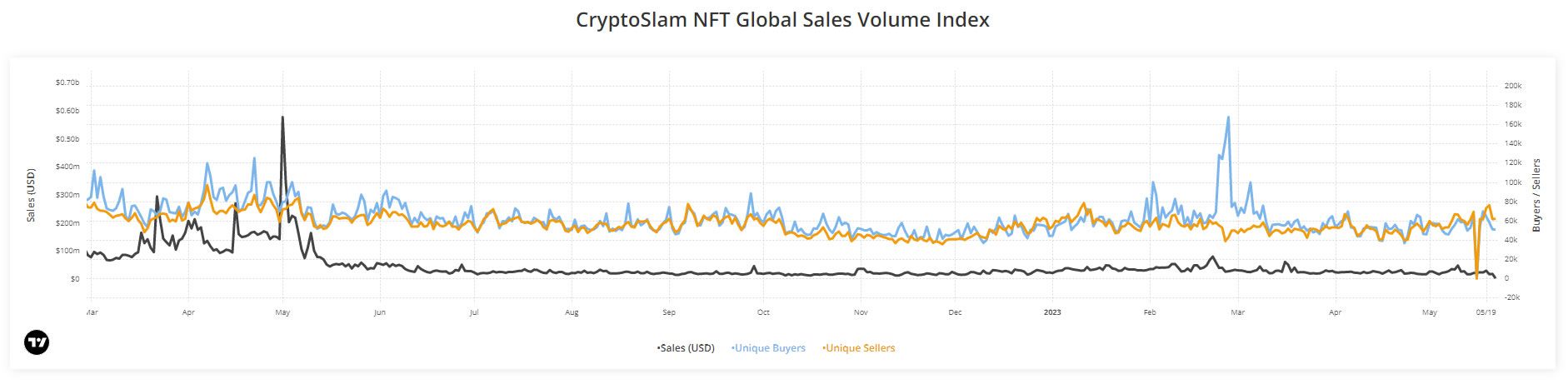 CryptoSlam reports that overall NFT sales volume has declined by 84% from April 2022 to April 2023.