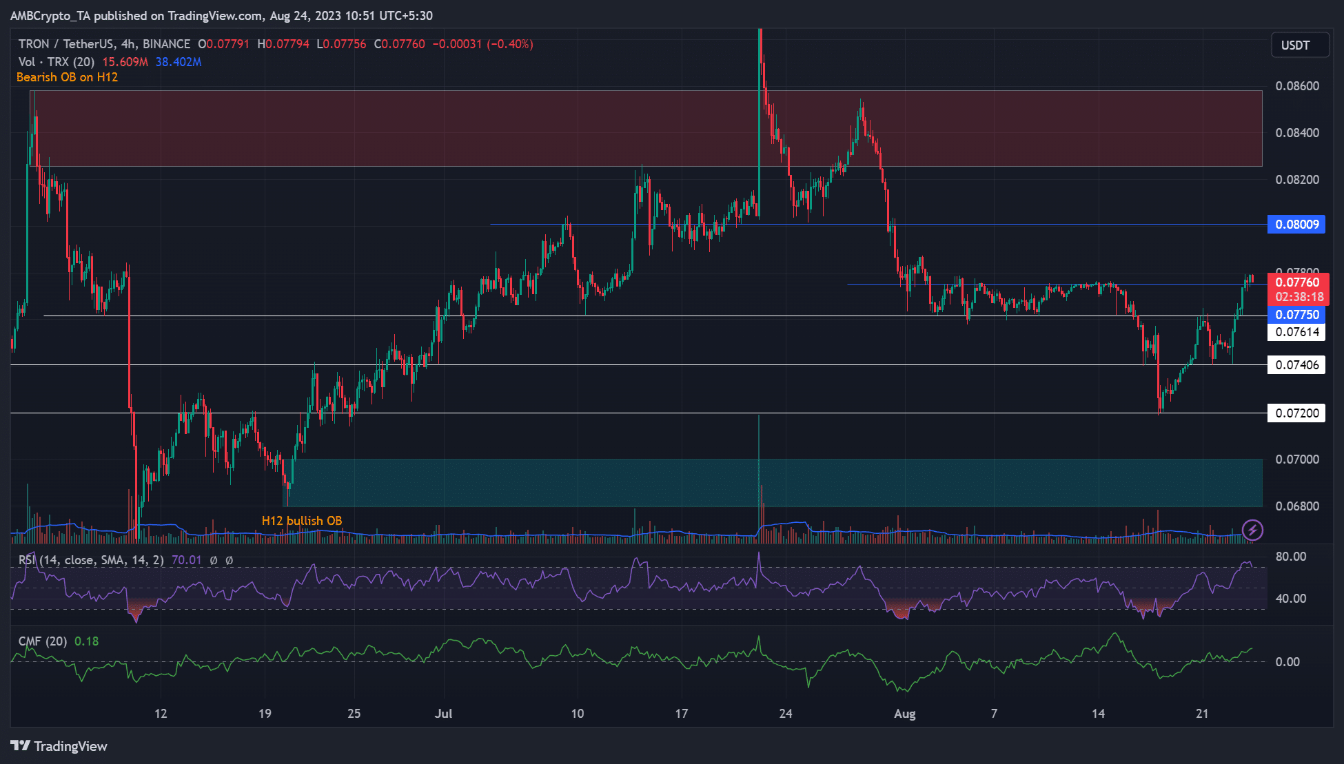 The daily candlestick session on 23 August closed above the previous range-high ($0.07750) – A sign of extra bulls’ leverage. So, TRX bulls could be tipped to aim for the next resistance target of $0.080 or the H12 bearish order block (OB) of $0.0826 – $0.0858. Such a move could offer 3% or 6.5% extra gains, respectively.