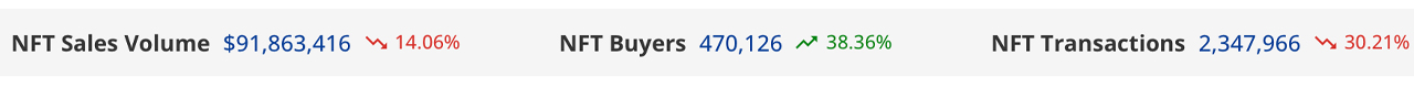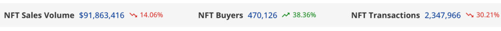 According to the latest statistics, sales of non-fungible tokens (NFTs) have taken a 14% dip compared to the preceding week, tallying up to $91.86 million in the past seven days. Interestingly, the count of purchasers rose by 38%; however, NFT transactions witnessed a decline of over 30% during this week.