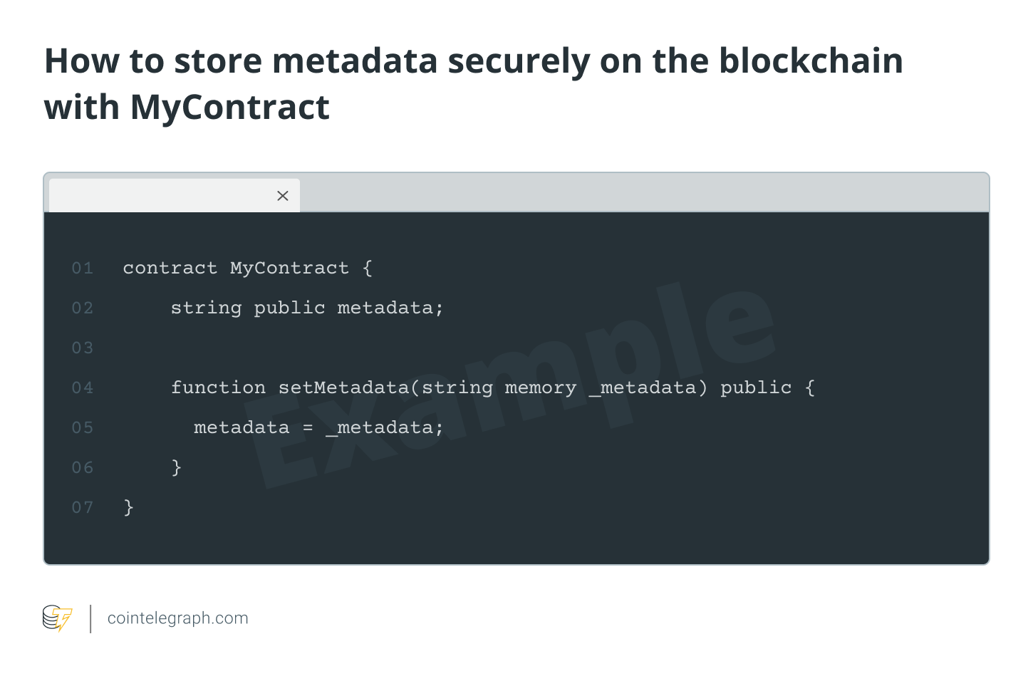 In the above example, the smart contract called MyContract has a publicly readable metadata variable and features a function called setMetadata that enables the metadata to be updated.