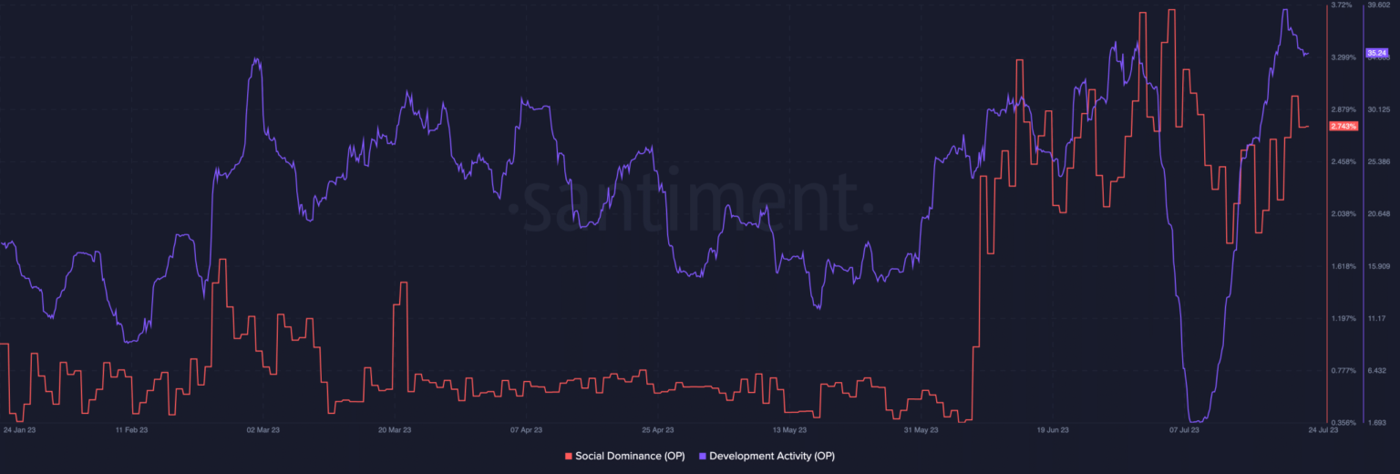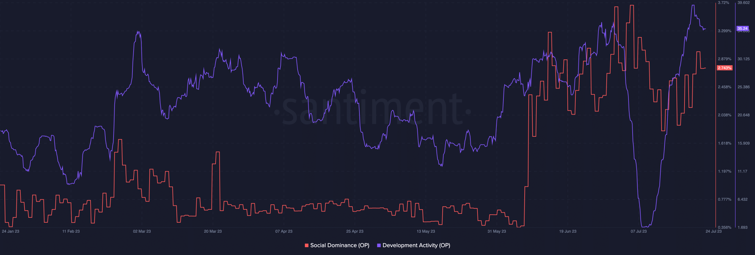 However, social dominance was not the only metric with a noticeable increase. Like the metric, OP’s development activity increased to 35.24.
