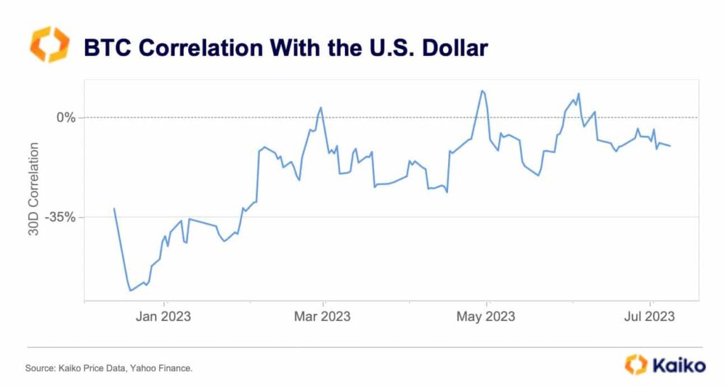 However, this relationship has mostly dissipated in 2023. According to crypto market data provider Kaiko, the inverse correlation between BTC and the USD fell from -61% to -10 on a year-to-date (YTD) basis, which was almost negligible.