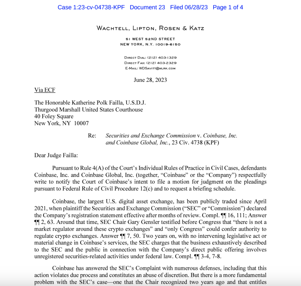Screenshot of Coinbase’s motion on June 28. Source: CourtListener.