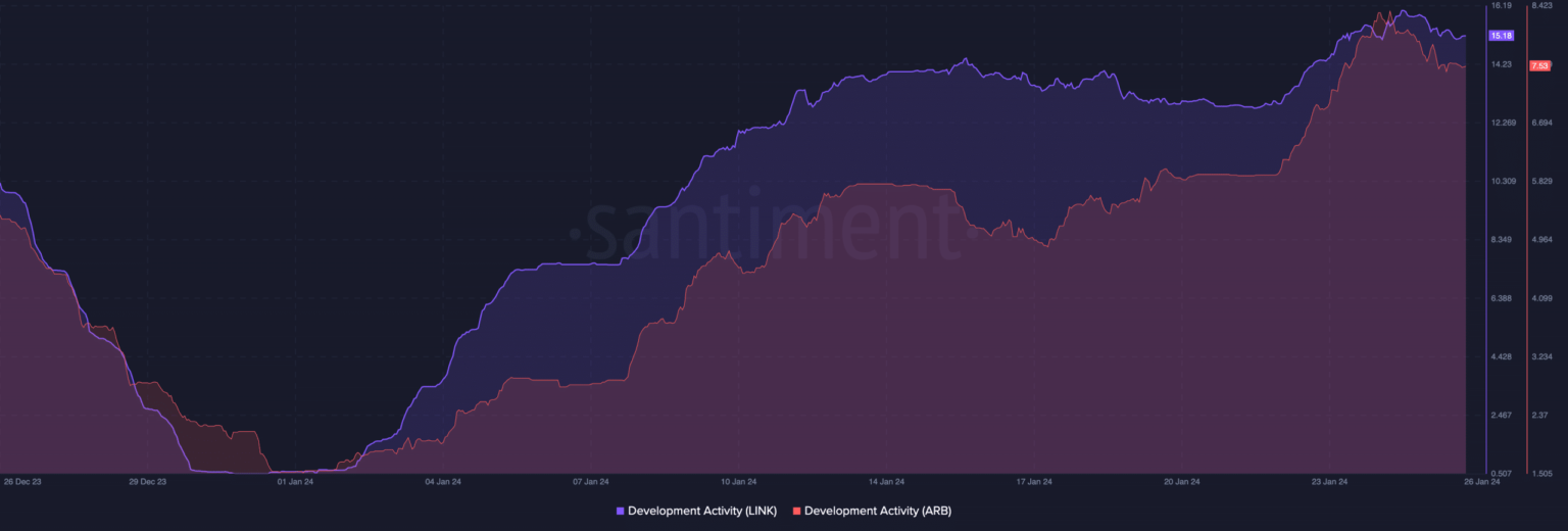 Furthermore, AMBCrypto then looked into the development activity at both ends. At press time, Santiment’s data showed that the development activity metric on Arbitrum and Chainlink has grown significantly.