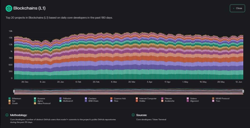 Polkadot remains one of crypto’s largest developer ecosystems and its full-time developer count at the time of writing was 169 as per Token Terminal, third-largest among layer-1 (LI) networks. The total number of commits to the projects’s GitHub repositories was 78.